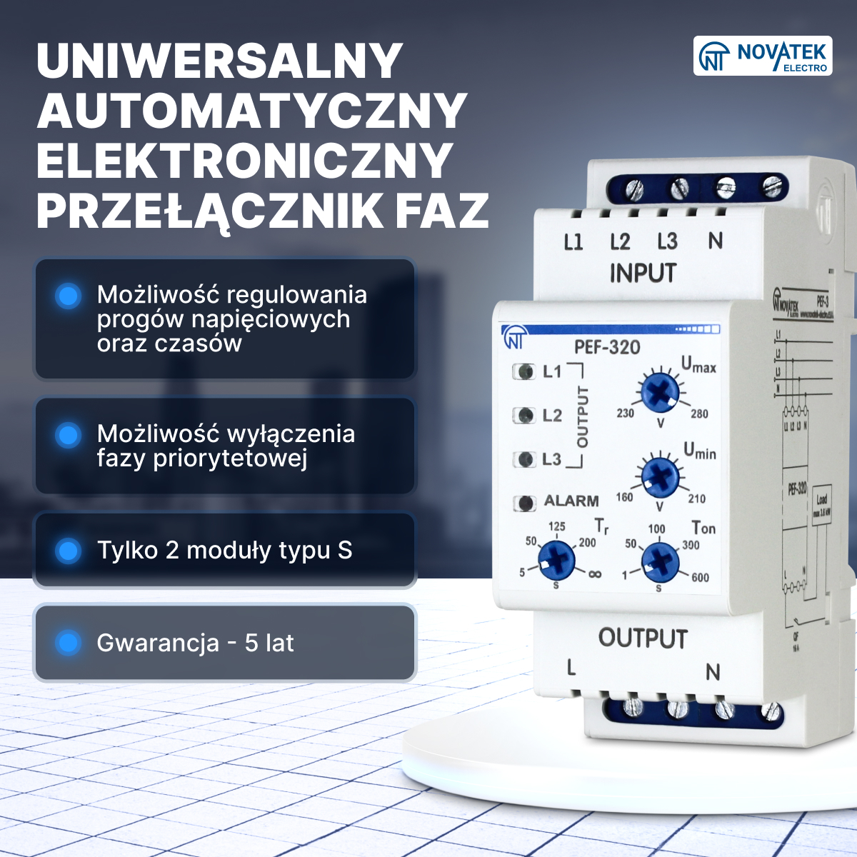 Uniwersalny automatyczno-elektroniczny przełącznik faz PEF-320 jest przeznaczony do zasilania przemysłowych i domowych odbiorników jednofazowych o napięciu 230 V, 50 Hz z trójfazowej sieci przewodowej (3x400 V + N).